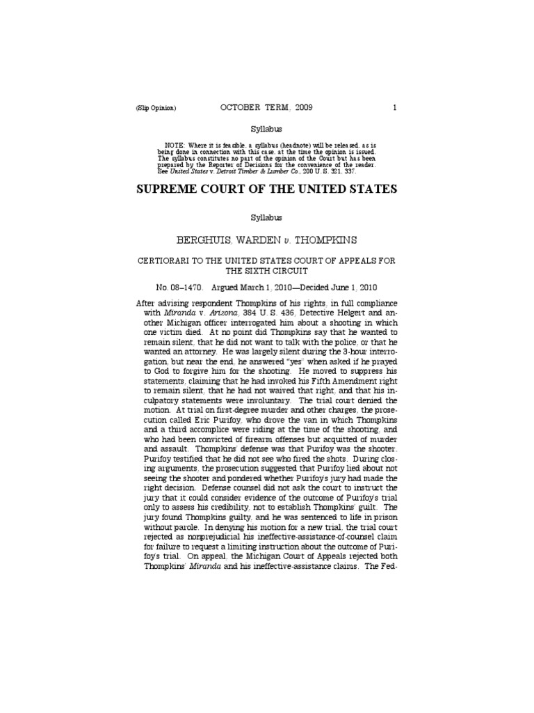 Berghuis V. Thompkins - LSTD301 week 6 forum - 1 In Berghuis v Thompkins 560 U.S ... : Thompkins (defendant) was interrogated about his involvement in a murder.